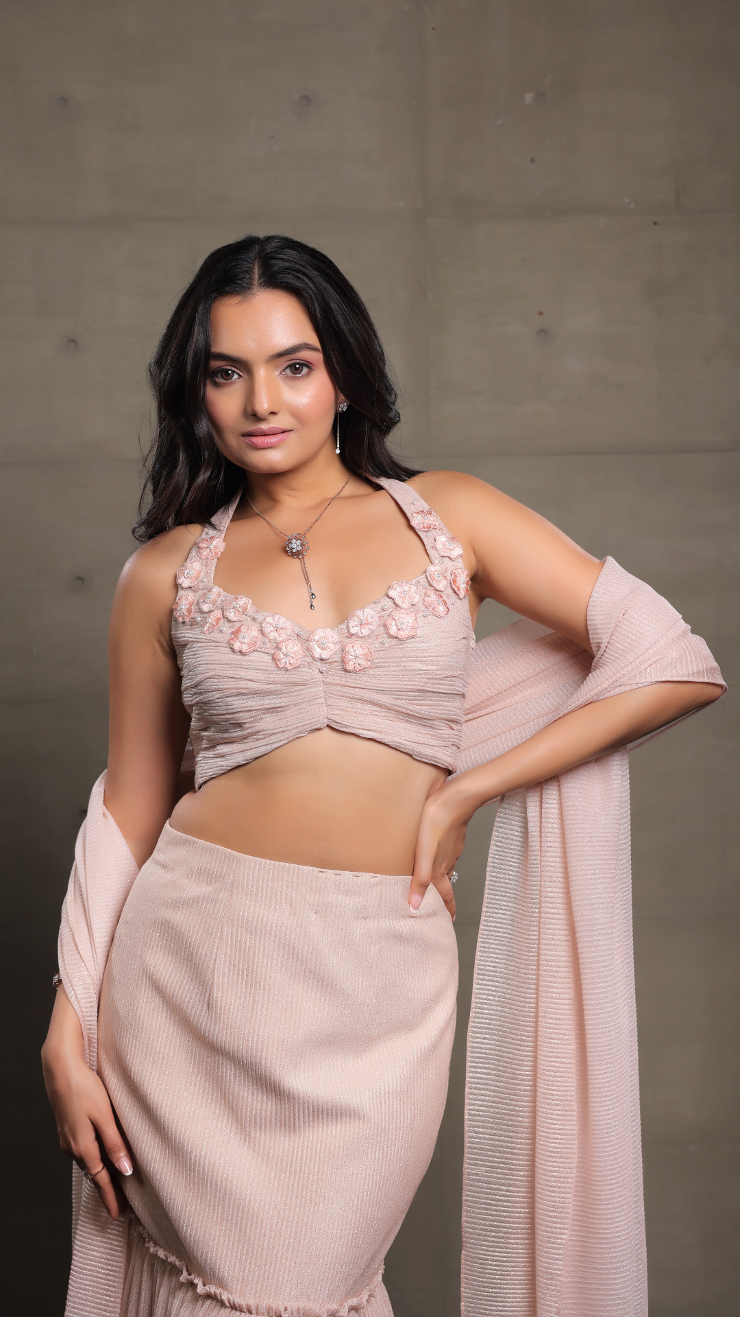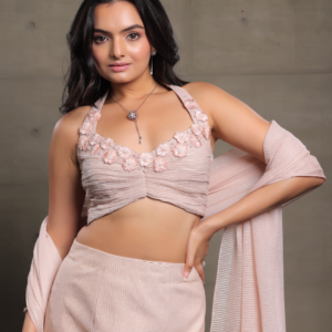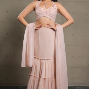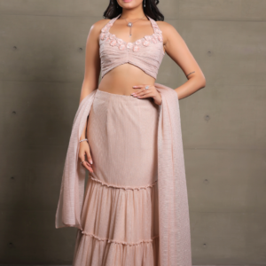 Elevate your festive wardrobe with our FAIRY lehenga set, crafted from shimmery fabric in a flattering mermaid cut. The backless top features exquisite floral appliqué and beaded embroidery, making it the perfect choice for Haldi and Mehendi celebrations or evening parties.